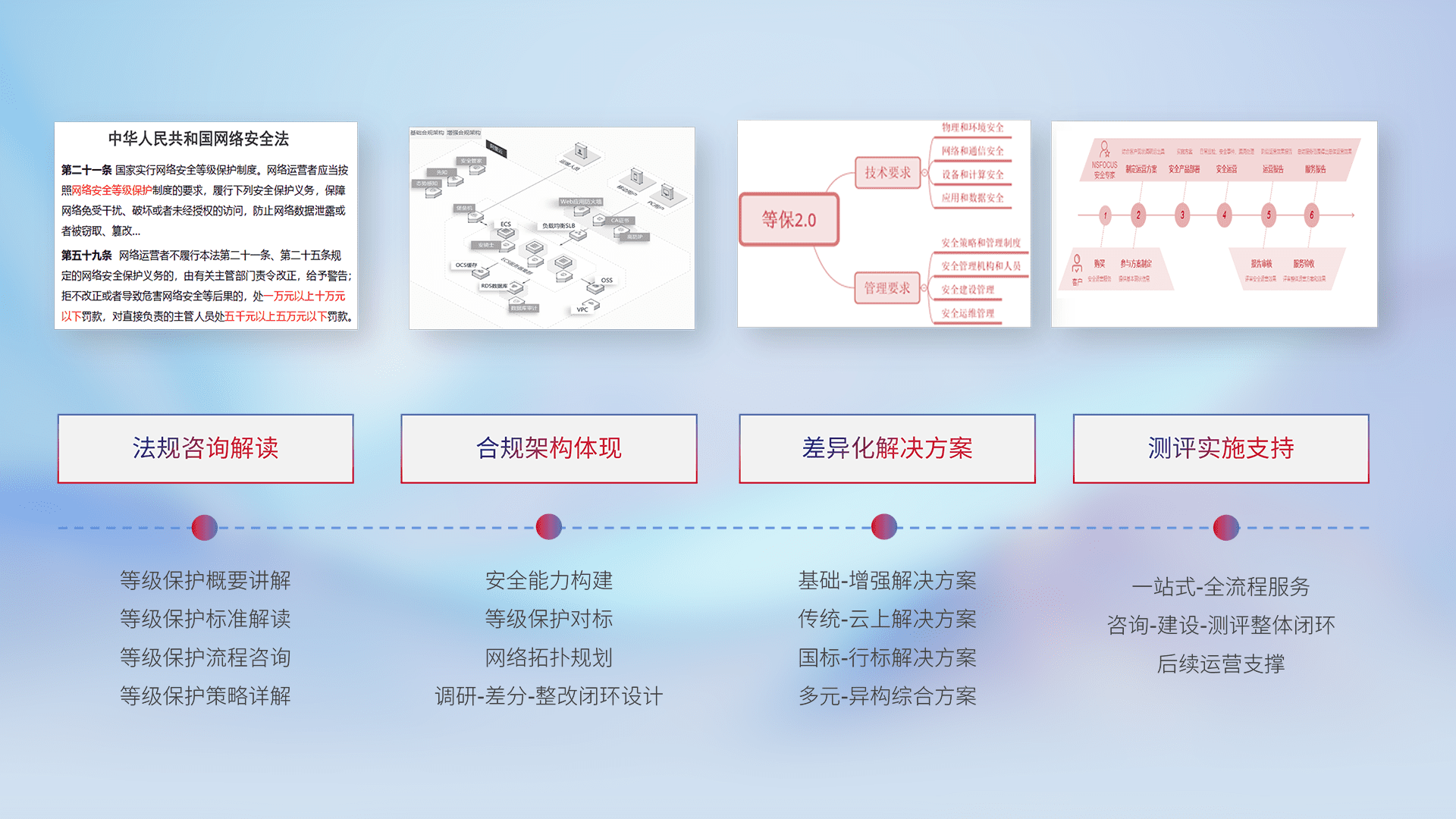 通过专业的法律咨询解读、、合规架构体现、、、差异化解决方案、、、测试实施支持等服务,,,为客户量身打造等保合规体系。。。。